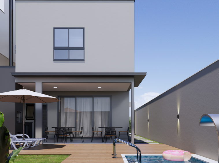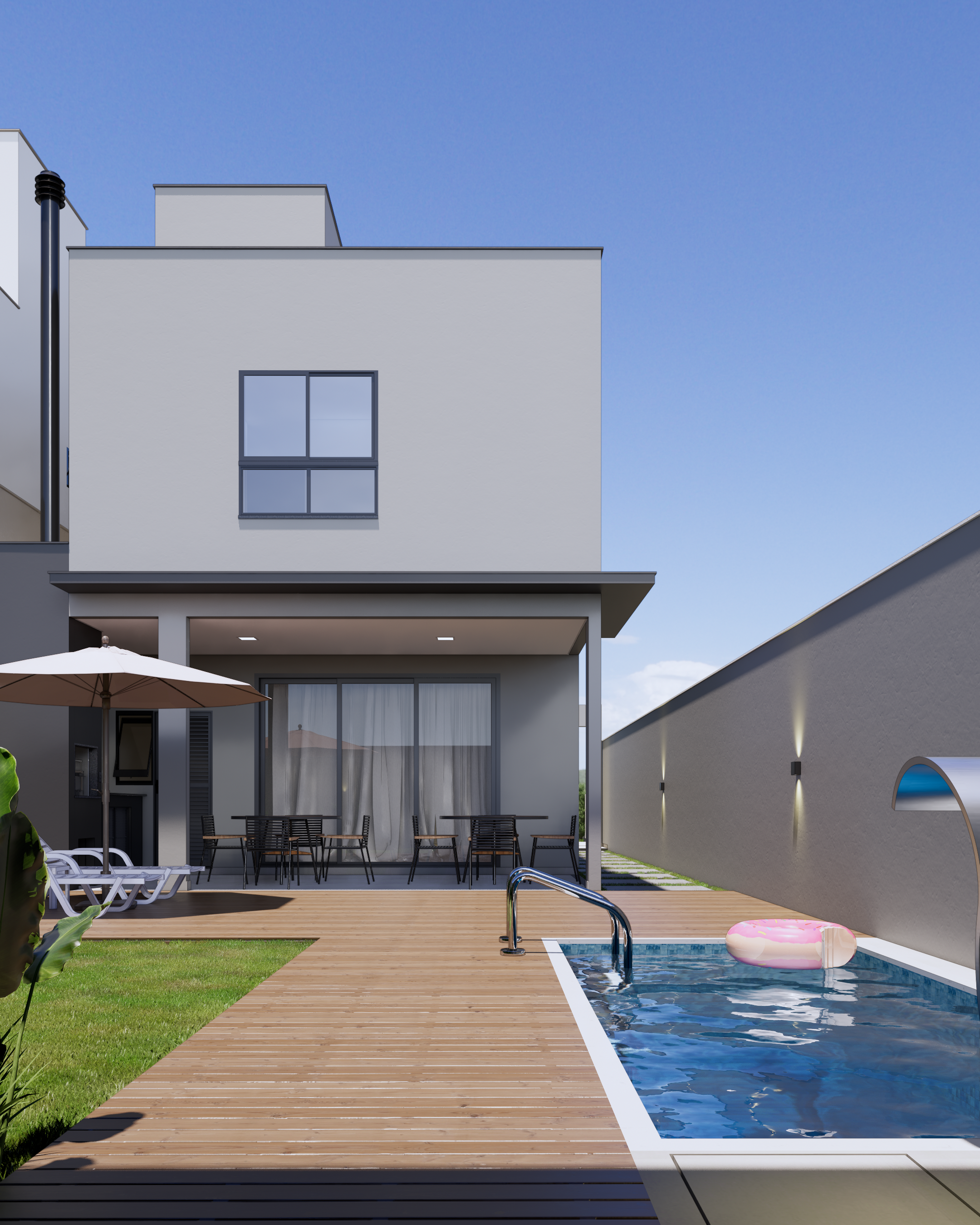 – Pátio com deck em madeira e piscina, com acesso lateral