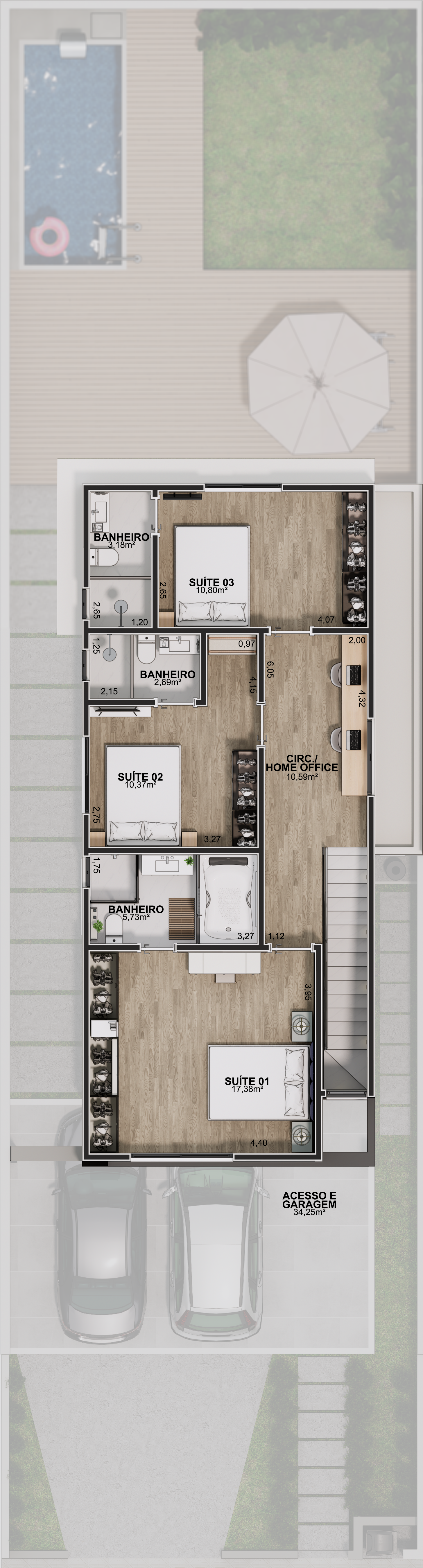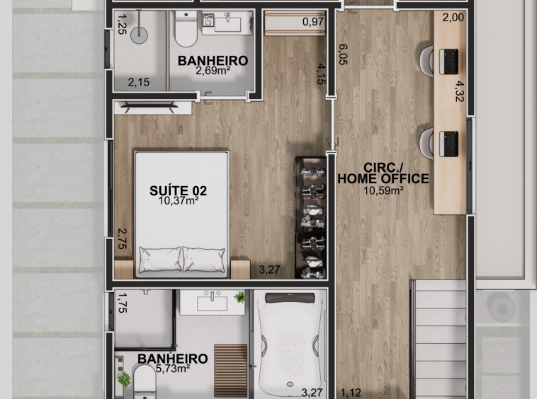 – Pavimento superior com circulação e bancada de escritório