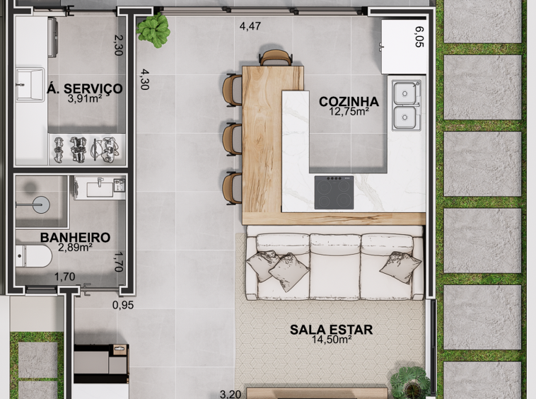 O saldo final de 60% pode ser pago na entrega das chaves, com possibilidade de financiamento pelo banco de sua preferência.